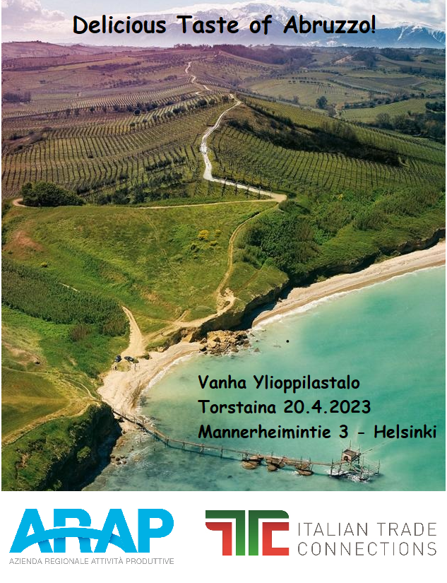 Abruzzon alueellinen tuottajajärjestö ARAP on koonnut yhteen 13 italialaista yritystä (viinit ja elintarvikkeet), jotka esittelevät tuotteitaan Helsingissä alan ammattilaisille.