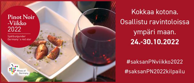 Saksan Viinitiedotus järjestää jälleen Saksan Pinot Noir -viikon lokakuun lopussa. Viikolle osallistuu erityistarjonnallaan yhteensä 9 ravintolaa Tampereelta, Turusta, Helsingistä, Espoosta ja Mikkelistä.