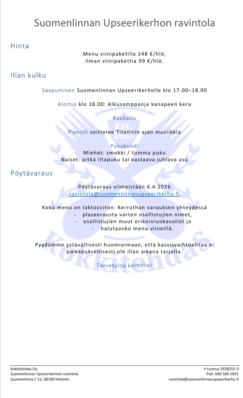 Varaa paikkasi viimeistään 6.4.2026 sähköpostitse ravintola(at)suomenlinnanupseerikerho.fi