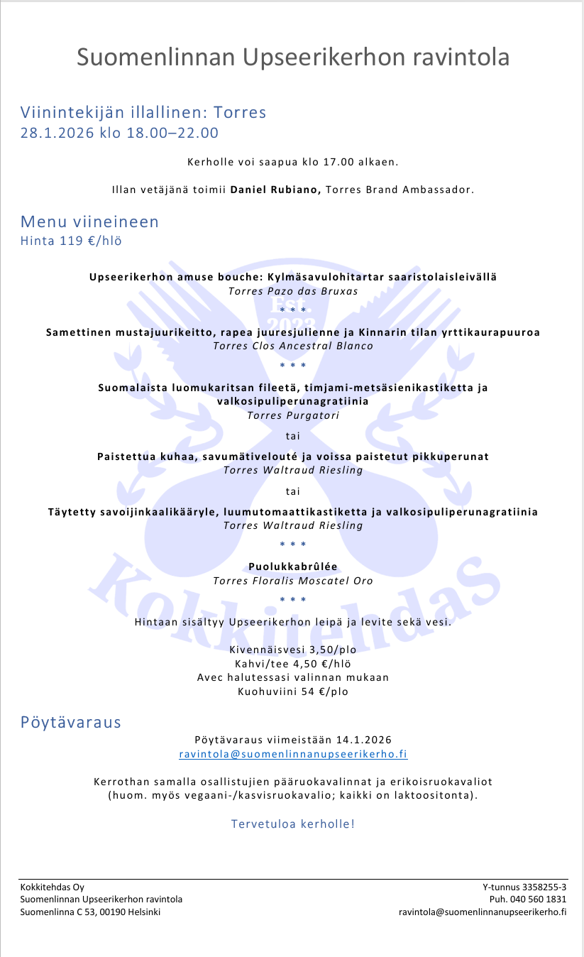 Torres – viinintekijäillallinen Suomenlinnan Upseerikerholla